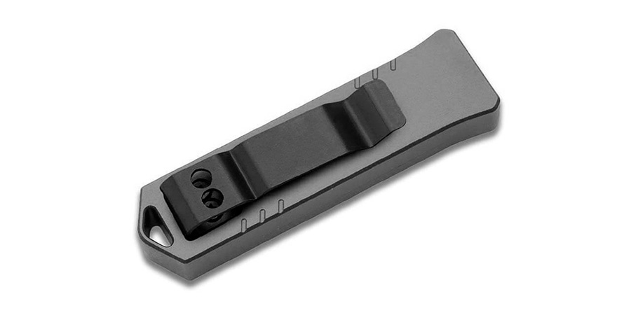 Чёрная строгая и прямоугольная рукоять ножа USB выполнена из алюминиевого сплава, что позволяет снизить вес до, практически неощутимых, 33 г. Плоскости вполне могут разместить на себе памятную гравировку, если вдруг возникнет желание кастомизировать нож. Есть лаконичные насечки добавляющие рукояти цепкости. На одной стороне разместился ступенчатый ползунок, отвечающий за открытие и за закрытие ножа, другая сторона плоская и без лишних изысков. Клипса в данной модели не предусмотрена. Зато имеется довольно широкое темлячное отверстие в навершии.