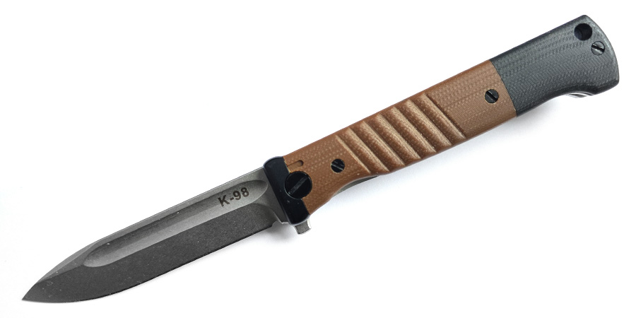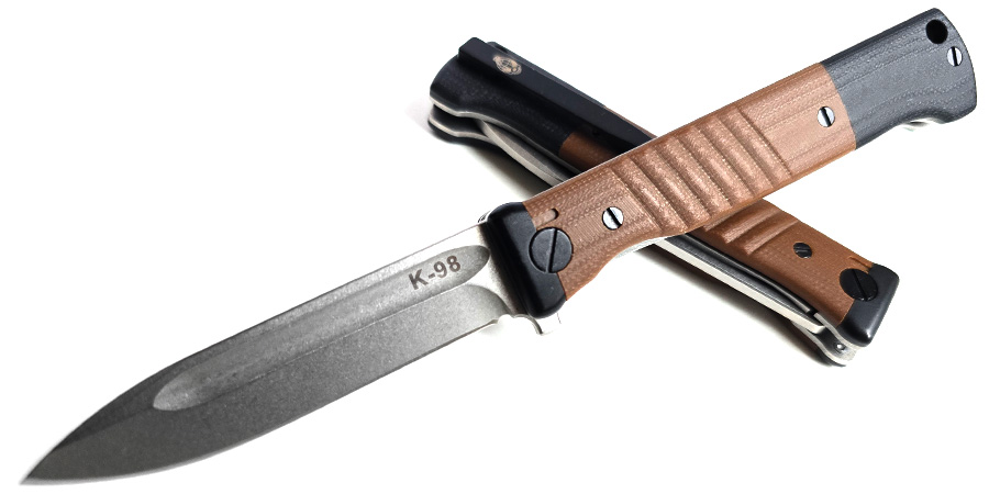 Нож K-98 это компактный современный складной нож продолжающий тему трибьютов к штык-ножам. Первым был АП-47. Если в текстах к предыдущим штык-ножам я апеллировал к патрулям комендатуры и армейской службе, то К98 я могу назвать максимально народным. Да чужой, да трофейный, но в каждой деревне он был. Миллионы единиц скота по всей стране были забиты именно этими маузеровскими ножами. Наверняка многие из вас это помнят. Трофейный штык был у всех на слуху и стал действительно знаком Великой Победы ибо был отобран у злейшего врага и пущен в самую сельскую работу без пиетета и придыхания. К-98 это отличный, компактный, быстро открывающийся флиппер с керамикой в осевом. Имейте ввиду - это самый маленький из моих штык-ножей. Внимательно смотрите на размеры приведенные ниже.