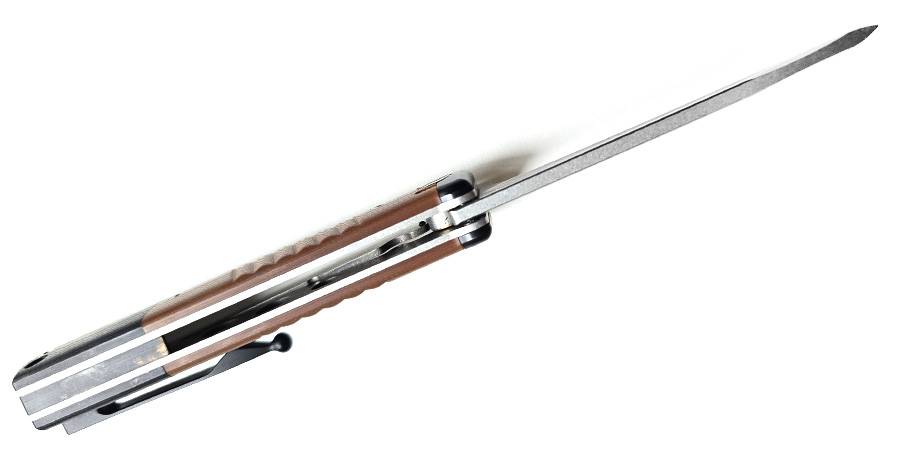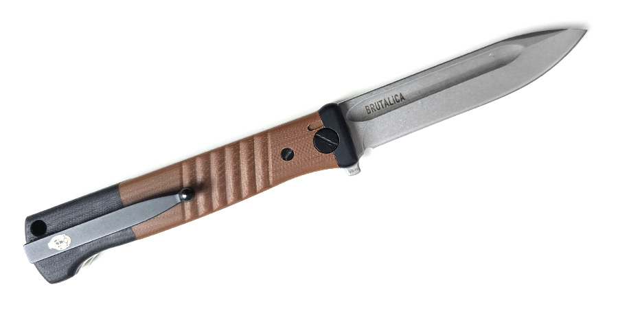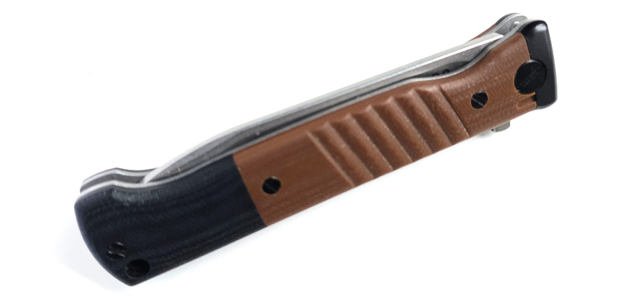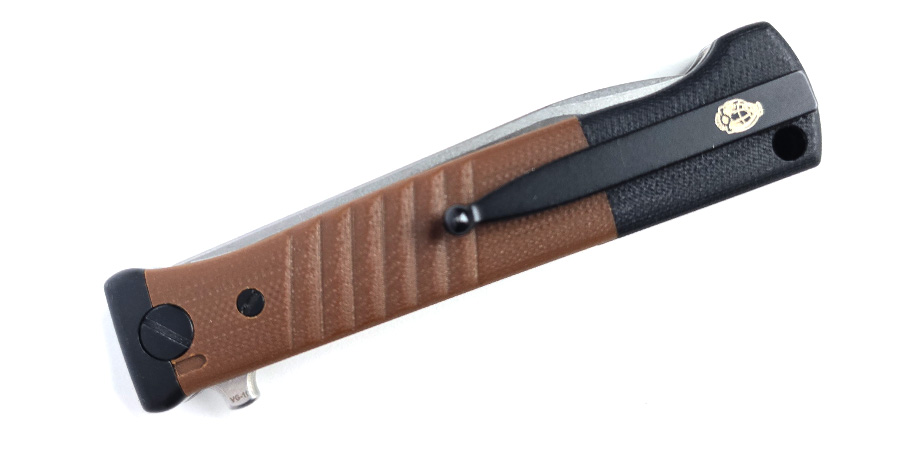 Рукоять ножа полностью похожа на "ту самую". Чтобы добиться максимального сходства с прародителем рукоять создана многосоставной и весьма сложной. Притины металлические, тело рукояти из коричневого G-10 и тыльник из черного G-10 это всё также отдельные детали. Темлячное отверстие присутствует. Клипса повторяет контуры ножен штык-ножа от Маузера. Остальные элементы рукояти носят исключительно декоративный характер и служат лишь для придания большего сходства с исходником.