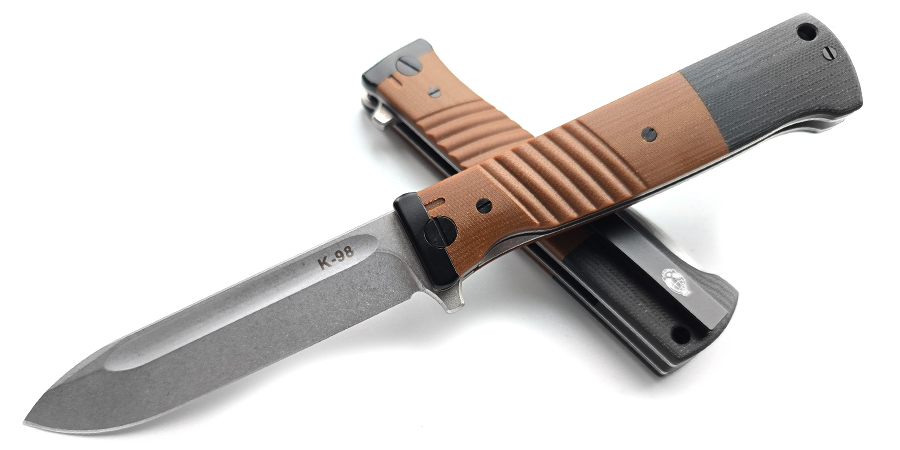Нож K-98 XL это компактный современный складной нож продолжающий тему трибьютов к штык-ножам. Первым был АП-47. Если в текстах к предыдущим штык-ножам я апеллировал к патрулям комендатуры и армейской службе, то К98 я могу назвать максимально народным. Да чужой, да трофейный, но в каждой деревне он был. Миллионы единиц скота по всей стране были забиты именно этими маузеровскими ножами. Наверняка многие из вас это помнят. Трофейный штык был у всех на слуху и стал действительно знаком Великой Победы ибо был отобран у злейшего врага и пущен в самую сельскую работу без пиетета и придыхания. К-98 это отличный, компактный, быстро открывающийся флиппер с керамикой в осевом. Имейте ввиду - это самый маленький из моих штык-ножей. Внимательно смотрите на размеры приведенные ниже.