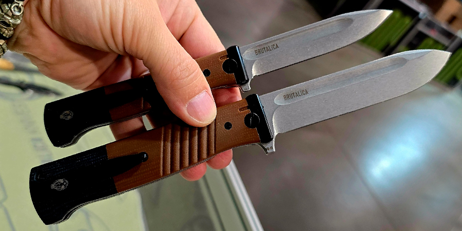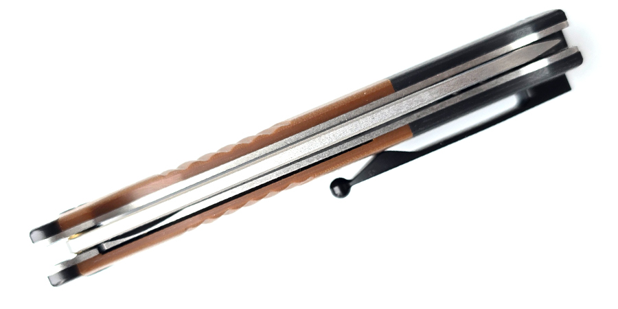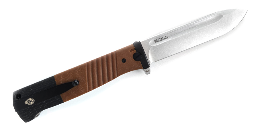 Рукоять ножа полностью похожа на "ту самую". Чтобы добиться максимального сходства с прародителем рукоять создана многосоставной и весьма сложной. Притины металлические, тело рукояти из коричневого G-10 и тыльник из черного G-10 это всё также отдельные детали. Темлячное отверстие присутствует. Клипса повторяет контуры ножен штык-ножа от Маузера. Клипса очень жесткая - почти как у Cold Steel. Остальные элементы рукояти носят исключительно декоративный характер и служат лишь для придания большего сходства с исходником.