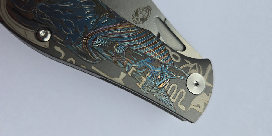Тот случай, когда клинок и рукоять ножа гармонируют и дополняют друг друга, создавая целостную картину. Рукоять ножа Tsarap Folder достаточно крупная, имеет приличную толщину и отличное соотношение к длине клинка. Её основа - титановые полосы, разделённые титановым спейсером. Сами накладки округлой формы с подпальцевыми выемками. Рукоять Tsarap Folder отлично ложится в руку и хорошо заполняет ладонь и при работе различными хватами никаких неудобств не вызывает. Клипса имеет потайное крепление на двух винтах и установлена на правую сторону только в положении tip-up, темлячное отверстие в рукояти Tsarap Folder отсутствует.