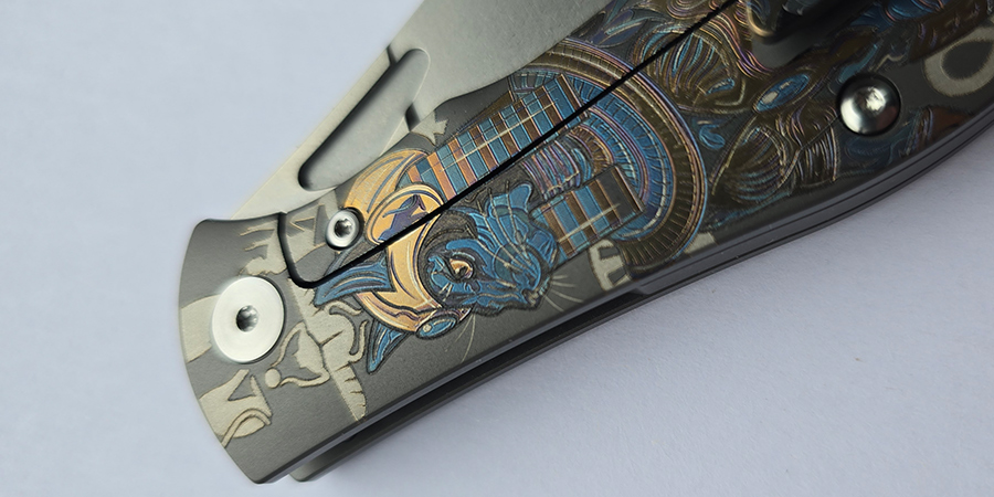 При открытии ножа Tsarap Folder неизменно раздаётся сочный «клац» радующий владельца и иногда почему-то нервирующий окружающих. Легкость хода обеспечивается керамическим однорядным подшипником в бронзовой обойме. Нож Tsarap Folder оснащён замком типа Frame Lock. Подобный тип замка всем хорошо знаком и любим многими производителями ножей. Простота конструкции и надёжность фиксации клинка – вот залог его популярности. В замке установлен твердосплавный сухарь - специальная пластина контактирующая с пятой клинка и сопротивляющаяся износу титана. Сухарь дополнен специальным флажком, который не дает вам случайно отогнуть фрейм дальше нужного.