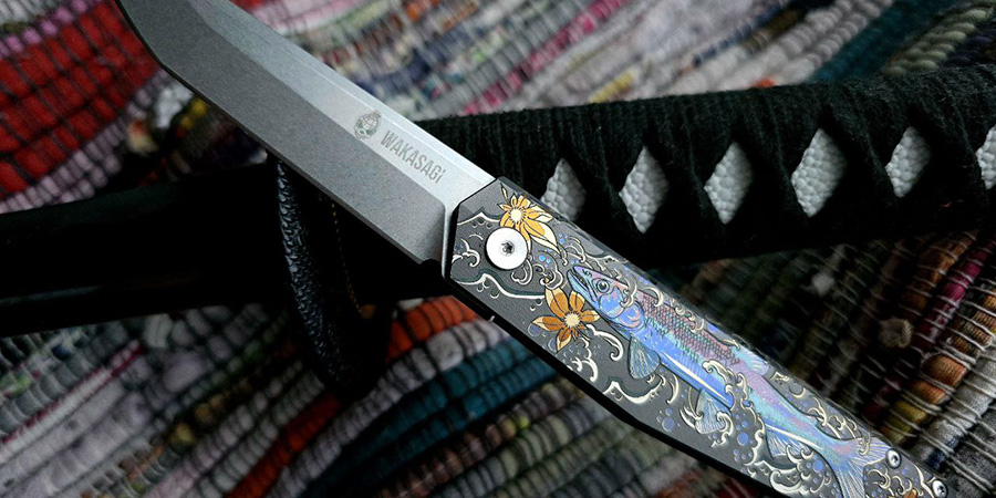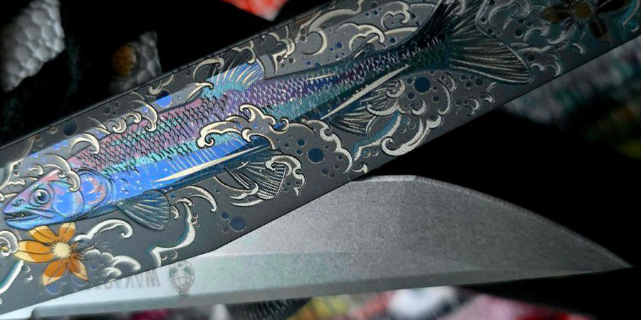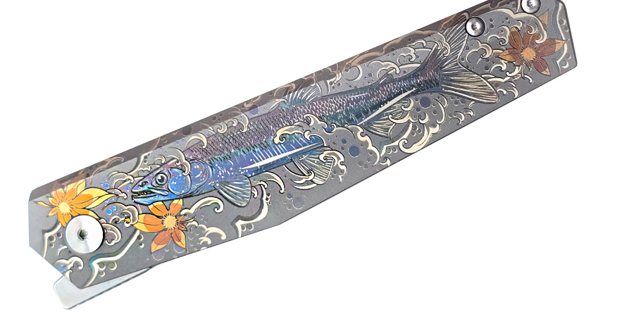 Лимитированный выпуск татуированых Корюшек от Бруталики. Цветной лазер с глубоким рельефом. Всего 50 штук. Wakasagi - это новый титаново-порошковый фронтфлиппер от Бруталики. Моё видение Квайкена. Надеюсь он понравится вам. Wakasagi - это Корюшка - мне, как ленинградцу отдельно ценна эта балтийская рыбка. К этому ножу был непростой путь длиной в несколько лет. Механика пушечная, хваты удобнейшие - всё как всегда. На старте продаж предполагается цена 23 000 рублей, что тоже не просто так - 23й регион это уже моя вторая Родина. Надеюсь увидеть в сети много вариантов кастомизации этого ножа, как это уже было с титановым Царапом.